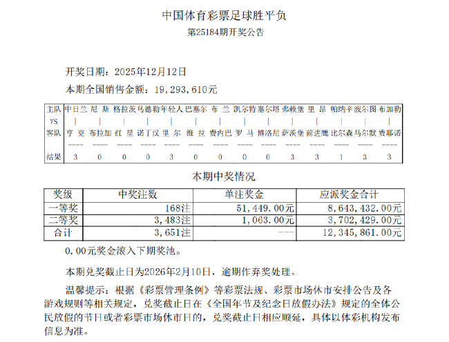 北京期间12月12日,足彩第25184期开奖服从揭晓。本期十四场头奖爆出168注,单注奖金51,449元;二等奖开3,483注,单注奖金1,063元;任选九场开18,758注,单注奖金663元。本期输赢彩销量为19,293,610元,任九投注总和为19,453,278元。