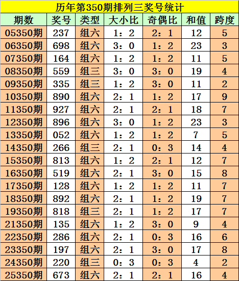陈列三第2025350期奖号:673,和值16,跨度4,大小比2:1,奇偶比2:1。